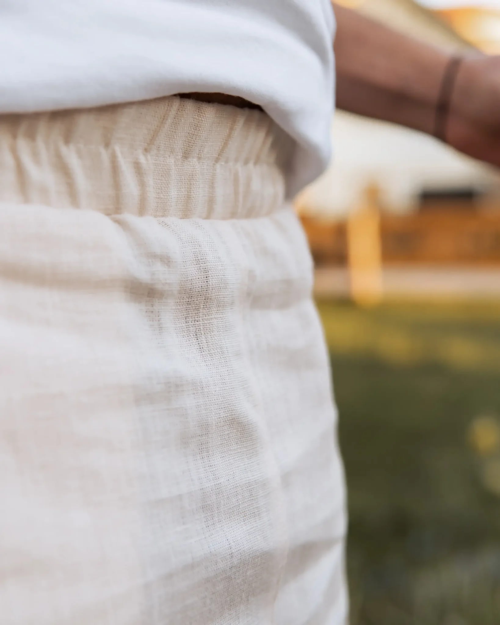 Empfehlung: Trage am besten hautfarbene, rote, orange oder schwarze Unterwäsche unter hellen Leinenfarben! Keine weiße Unterwäsche, diese scheint bei hellen Farben stärker durch als dunkle Unterwäsche.
