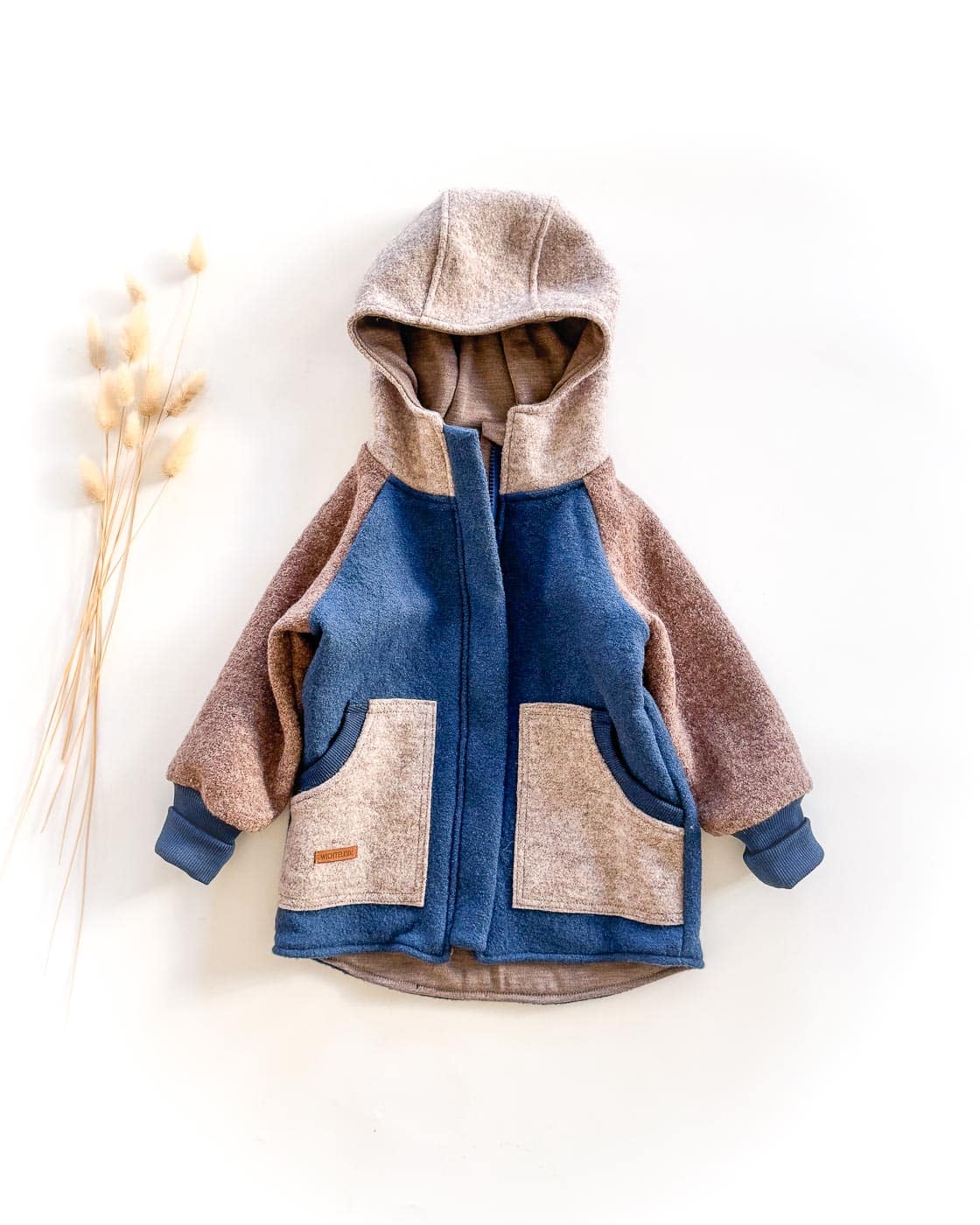 Sofortkauf: Colorblock Walkjacke mit Wolljersey Futter Schlamm und runder Kapuze, Gr. 92/98 Rauchblau/Sand Meliert/Schlamm