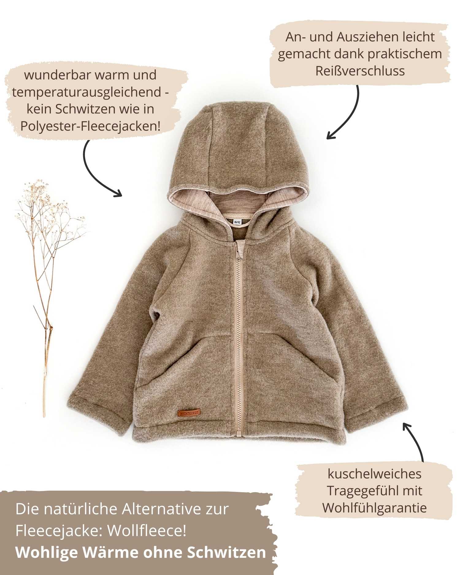 Kinder und Baby Jacken aus extraweichem Bio-Wollfleece. Mit praktischem Reißverschluss und großer Kapuze, die ebenfalls mit Merinowolle gefüttert ist.