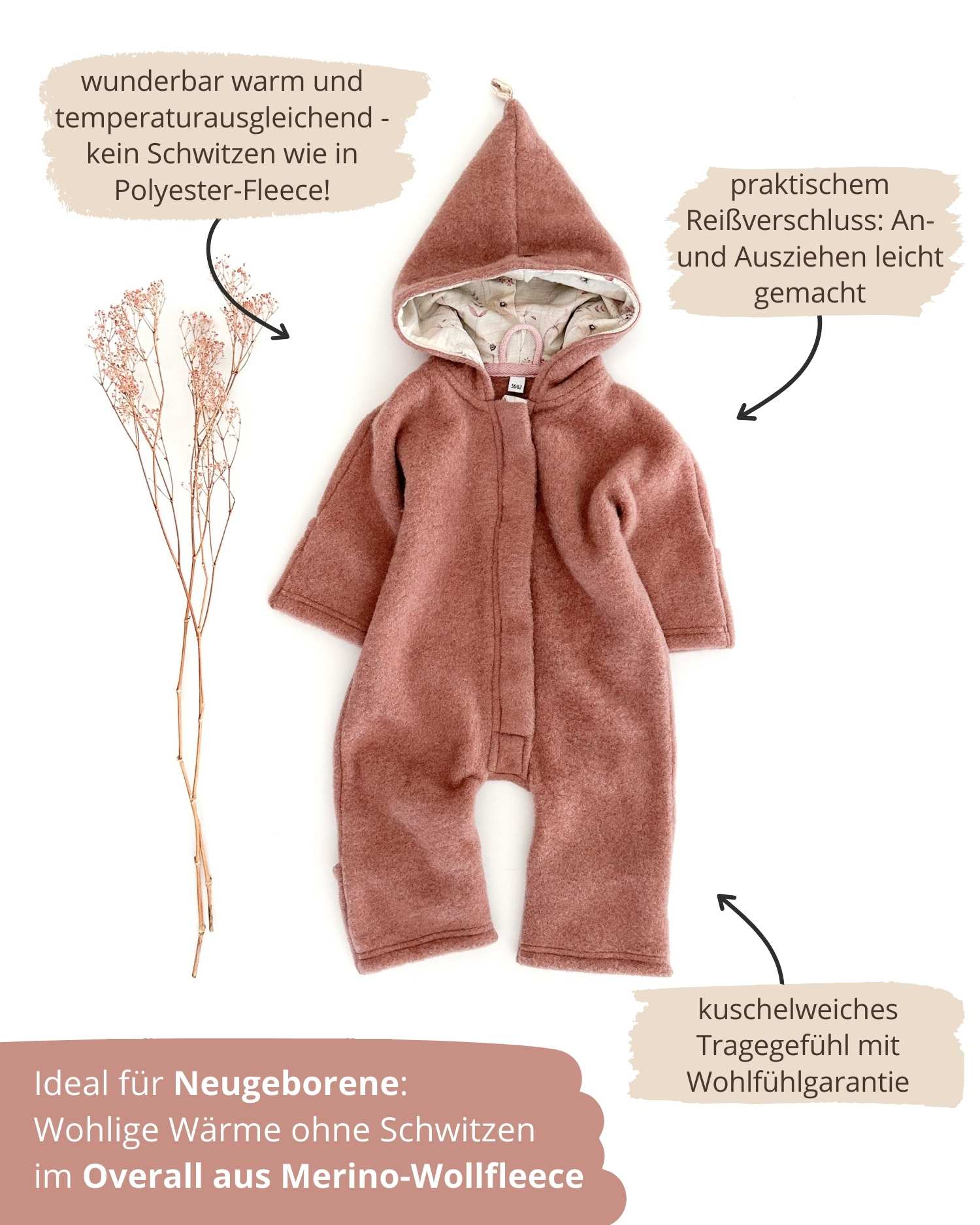 Kinder und Baby Overalls aus extraweichem Bio-Wollfleece. Mit praktischem Reißverschluss und großer Kapuze, die ebenfalls mit Merinowolle gefüttert ist.